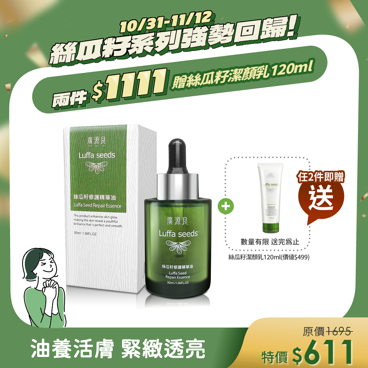 深層修復、活化肌膚絲瓜籽修護精華油30ml$611 -
